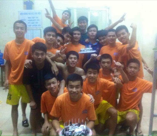 "Trong ảnh người cầm bánh kem là Quang Hải và cậu cởi trần đứng trước là Đình Trọng. Hồi đó, chúng em hay đùa nhau là lứa mình sẽ đưa Việt Nam vào World Cup", Nam nhớ lại kỷ niệm cùng các bạn tập luyện, ăn ở, học tập và cạnh tranh, ai cũng mong ước có một lò đào tạo nào đó để mắt đến và nhận vào.