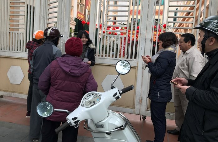 Theo ghi nhận của HNMO, đến 9h sáng nay, trước cổng trường Tiểu học Trần Quốc Toản (quận Hoàn Kiếm, Hà Nội), có hàng chục phụ huynh do không nắm được thông tin đã vội vã đến trường để đón con. Chị Hoàng Tuyết Hạnh (49 tuổi, có con đang học lớp 5 tại trường) cho biết sáng sớm nay, khi chưa nhận được tin nhắn từ cô giáo chủ nhiệm lớp con trai, chồng chị đã cho con đến trường từ sớm. Khi thấy các vị phụ huynh khác gọi điện thông báo các con được nghỉ học, chị phải bỏ dở việc để đến trường đón con về.