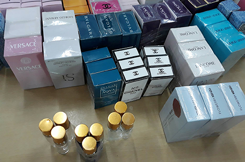 Gần 10.000 chai dầu thơm gắn nhãn hàng nổi tiếng thế giới như Chanel, Versace, Tommy, Gucci...; hàng loạt bao bì, nhãn mác, can đựng cồn bị thu giữ.
