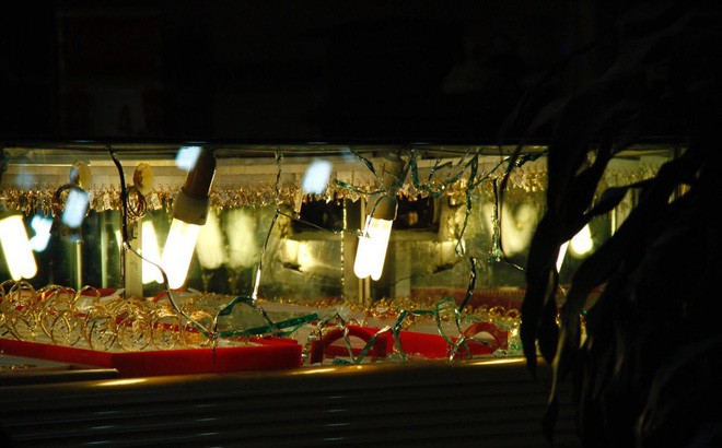 Chiếc tủ kính bị tên cướp đập bể. Ảnh: Phạm Diện.