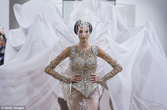 Dải voan to dài được nâng đỡ bởi các người mẫu hỗ trợ. Thiết kế khiến người xem cảm giác như đây là một nữ chúa trong bộ phim… khoa học viễn tưởng nào đó.