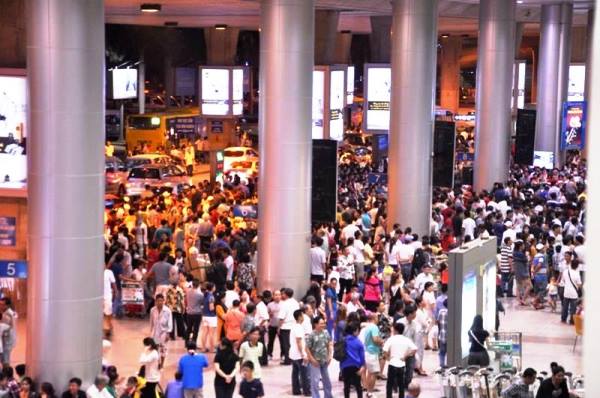 Hàng ngày người chen lấn nhau từng ô gạch để có chỗ đứng, những người già và trẻ nhỏ không đủ sức "lấn chiếm" thì đành phải nằm, ngồi vật vờ ở sảnh vì các băng ghế cũng chật kín người ngồi. Mặc dù đông như vậy, nhưng có những gia đình còn đưa cả chục người đến sân bay chỉ để đón một người về.