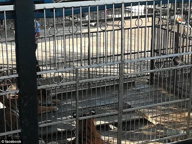 Những con hổ được nhốt trong chuồng tạm. Chúng phục vụ cho gánh xiếc.
