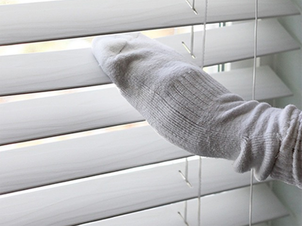 Vệ sinh cửa chớp bằng tất. Một đôi tất cũ có thể trở thành dụng cụ tuyệt vời để lôi đi những vết bẩn trên cửa. Chỉ cần đi tất vào tay và bắt tay vào công việc.