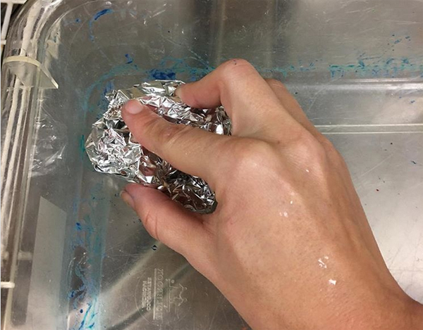 Khay nướng sạch bong nhờ giấy bạc. Vết bẩn trên khay nướng sẽ dễ dàng được làm sạch khi bạn dùng giấy bạc và ít thuốc tẩy.