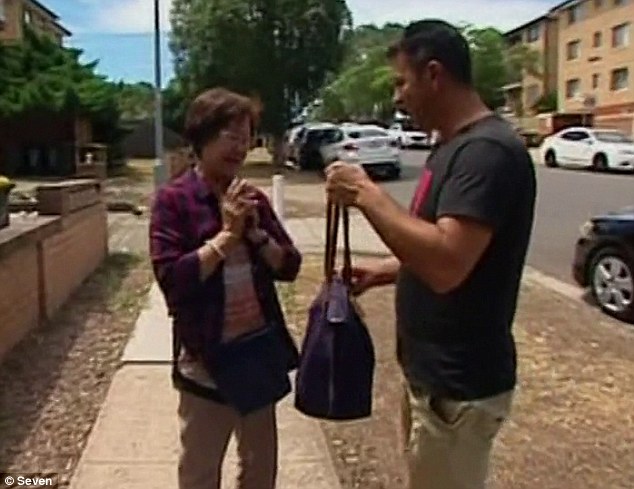 Anh Adem Gashi đang trao lại bóp cho bà En Huỳnh trưa thứ Hai. (7 News)