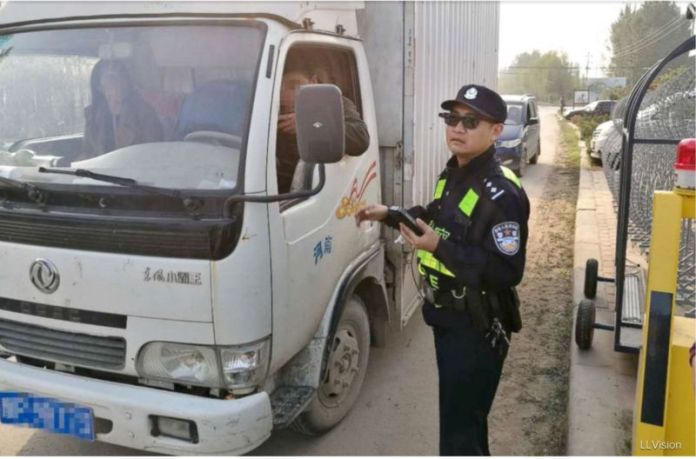 Công an Trung Quốc đeo kiếng nhận dạng chặn xe trên đường. (Hình: LLVision Technology Co.)