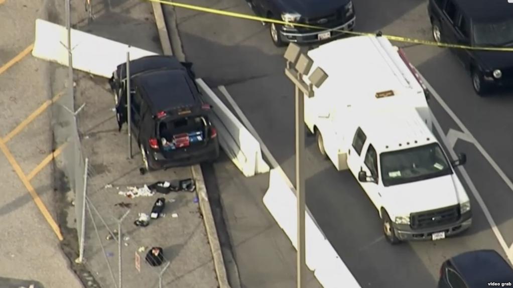 Một chiếc xe SUV màu đen đầy vết đạn, tung vào một rào cản làm bằng xi măng gần Cơ quan An ninh Quốc gia Hoa Kỳ ngày 14/2/2018 (Tiroteo NSA)