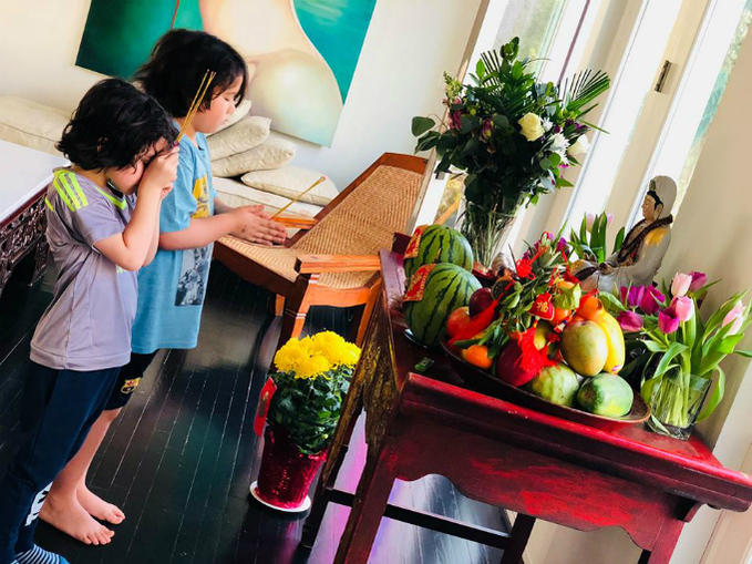 - Hai con của tôi 8 tuổi và 6 tuổi. Tôi luôn kể cho con mình nghe về tập tục Tết cổ truyền của người Việt, sự tích bánh chưng, lễ cúng đưa ông Táo về trời, cúng cơm ông bà, cúng Giao thừa, xông nhà; hay giải thích cho con vì sao bày dưa hấu trong ngày Tết. Tôi dạy các con chúc Tết và tất nhiên, hai nhóc cũng luôn thích làm như thế để được nhận lì xì.