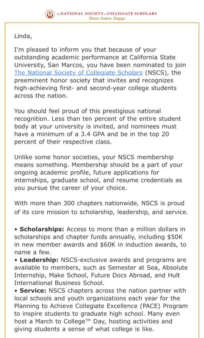 Linda cho hay, để trở thành thành viên của NSCS, sinh viên phải có điểm trung bình các môn học từ 3.4 đến 4.0 (điểm tuyệt đối). Tổ chức sẽ trao học bổng và giúp đỡ các học sinh, sinh viên có điều kiện học tập tốt hơn cũng như những cơ hội công việc sau khi tốt nghiệp.