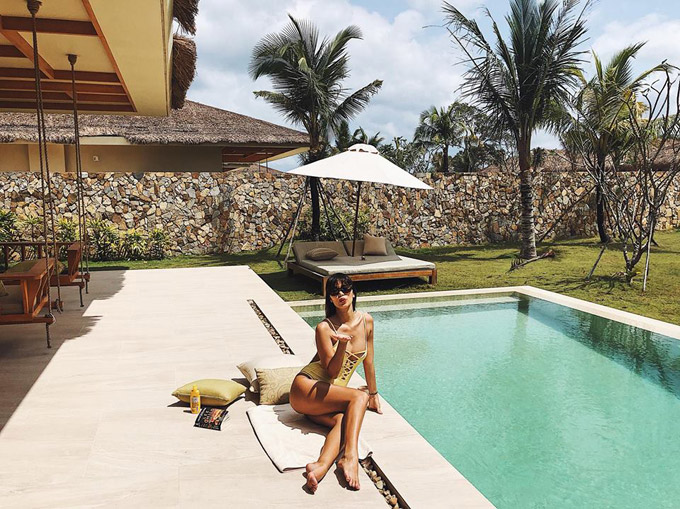 Sau những ngày ra Hà Nội đoàn tụ cùng gia đình trong dịp Tết Mậu Tuất, vợ chồng Hà Anh đã cùng nhau đi nghỉ tại một resort sang trọng ở Phú Quốc. Siêu mẫu cho biết, cô và ông xã dành phần lớn thời gian để tận hưởng không khí trong lành của vùng biển. Cô thích mặc áo tắm phơi nắng hoặc đọc sách, nhâm nhi uống trà.