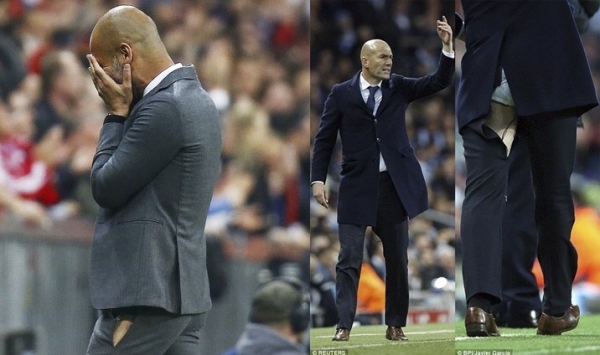 Hai HLV bóng đá nổi tiếng Zidane và Pep Guardiola với sự cố rách quần khi đang chỉ đạo trên sân.
