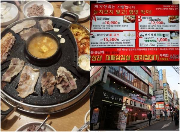 Chỉ tốn khoảng 10.900 won/người (khoảng 220.000 đồng) nếu bạn chọn menu A gồm nhiều loại thịt như ba rọi, thịt bò thăn, thịt cổ lợn... Rau, cơm trắng và kim chi ăn kèm không giới hạn. Ngoài ra mỗi bàn còn được phục vụ một nồi canh đậu nành hầm. Menu B có giá 12.900 won/người (khoảng 260.000 đồng) thì có thêm thịt gà rút xương. Bạn cũng không cần phải lo lắng nếu không thể nói tiếng Hàn, chỉ cần chọn A hoặc B là có nhân viên hướng dẫn bạn đến đúng bàn. Thịt ở đây khá tươi, dày và mềm, chất lượng khá ổn so với cái giá bỏ ra.