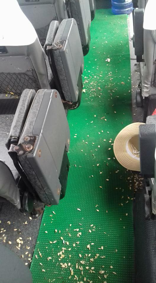 "Tháng tết này, chạy chuyến nào tôi cũng lượm vỏ hướng dương, vỏ dưa, bí đủ loại. Có người lên xe hỏi được hút thuốc không thì người bên cạnh đã phì phèo. Túi nilông trên xe nhiều, nhưng say xe nôn mửa thì bấm kính, nôn ra ngoài văng đầy cửa xe", tài khoản Nguyễn Thành Luân kể. Người khác lại chứng kiến cảnh khách ăn bưởi không hết xong nhét luôn nửa quả vào khe ghế, ba hôm sau mốc xanh, mốc đỏ.