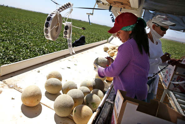 Các công nhân đang soạn những trái dưa cantaloupe ở một nông trại tại Firebaugh, California. Tình trạng hạn hán hiện nay và trong những năm sắp tới sẽ khiến cho các nông trại khó trồng trọt như hiện nay. (Justin Sullivan/ Getty Images)
