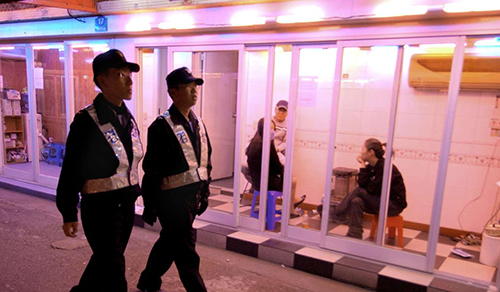 Cảnh sát đi qua phố đèn đỏ ở Seoul, Hàn Quốc. Ảnh: AFP