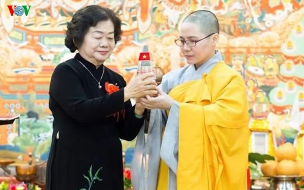Nguyên Phó Chủ tịch nước Trương Mỹ Hoa trao tặng biểu tượng cột mốc biên giới Việt Nam cho Sư cô Thích Nữ Giới Tánh.