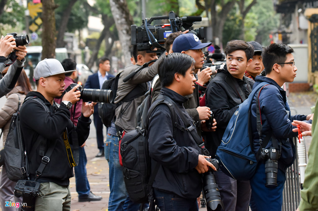 Nhiều phóng viên tác nghiệp bên ngoài hàng rào sắt. Khu vực này cách phòng báo chí tác nghiệp hơn 20 m. Cạnh hàng rào, cảnh sát bố trí lực lượng làm nhiệm vụ.