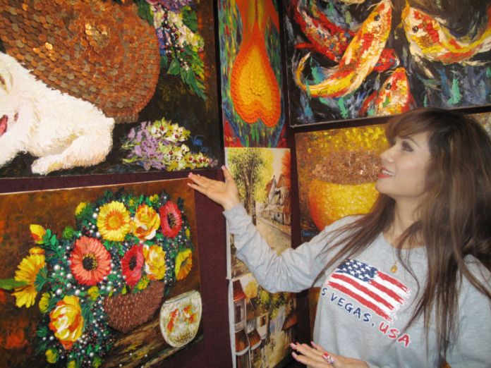 Họa sĩ Nguyễn Thị Thùy Vân bên những bức trong phong thủy của chị.