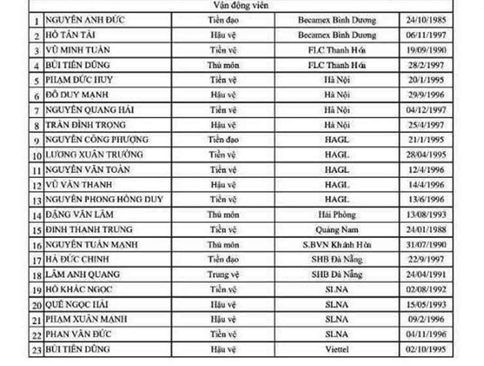 Điều khiến nhiều người thắc mắc là tiền đạo đội trưởng Nguyễn Văn Quyết không góp mặt. Tiền đạo CLB Hà Nội không thi đấu trong hai trận đấu vừa qua tại V-League 2018 do án treo giò vì hành vi thúc cùi chỏ vào mặt Nghiêm Xuân Tú ở mùa giải trước. Đây có thể là lý do khiến anh không được HLV Park Hang-seo triệu tập.