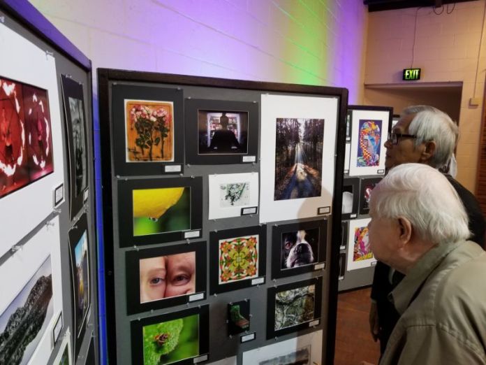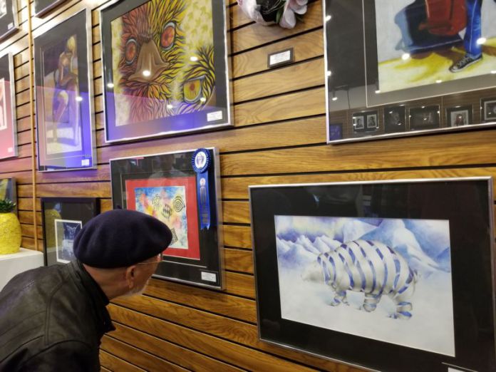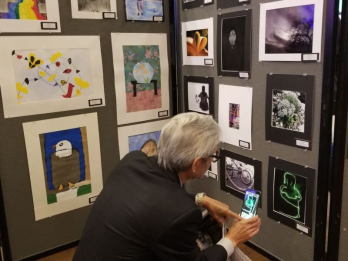 Giáo Sư Lê Văn Khoa (bìa) ngắm nhìn những sáng tạo nghệ thuật của học sinh Garden Grove. (Hình: Ngọc Lan/NV)