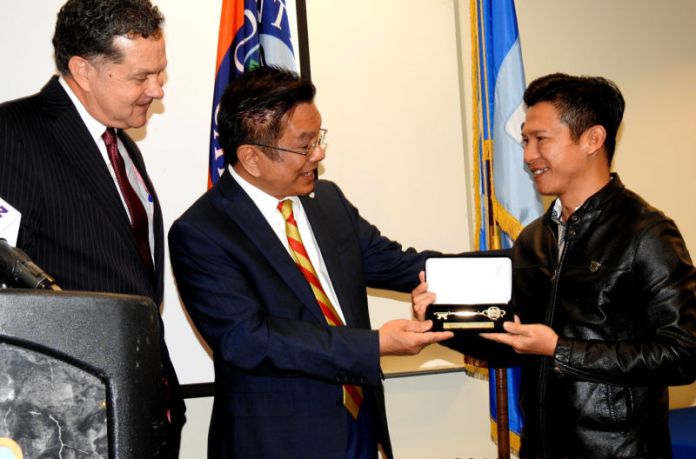 Nhạc sĩ Việt Khang (phải) nhận 'chìa khóa vàng thành phố' từ Nghị Viên Phát Bùi (giữa), đại diện thành phố, và dưới sự chứng kiến của ông Scott Stiles, tổng quản trị thành phố Garden Grove. (Hình: Linh Nguyễn/NV)