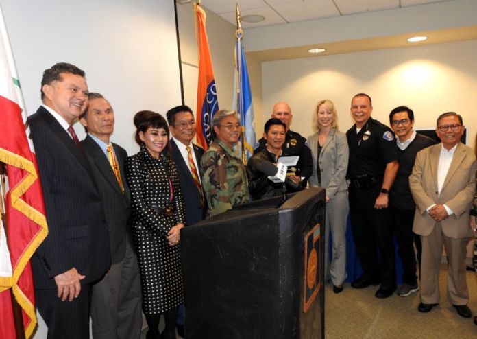 Nhạc sĩ Việt Khang (giữa) chụp hình với đồng hương người Việt, trong đó có nhạc sĩ Trúc Hồ (thứ hai từ phải), tổng giám đốc đài SBTN; các thành viên cộng đồng, nhân viên thành phố, và ông Todd Elgin, chỉ huy trưởng cảnh sát Garden Grove, bên cạnh nhạc sĩ Trúc Hồ. (Hình: Linh Nguyễn/NV)