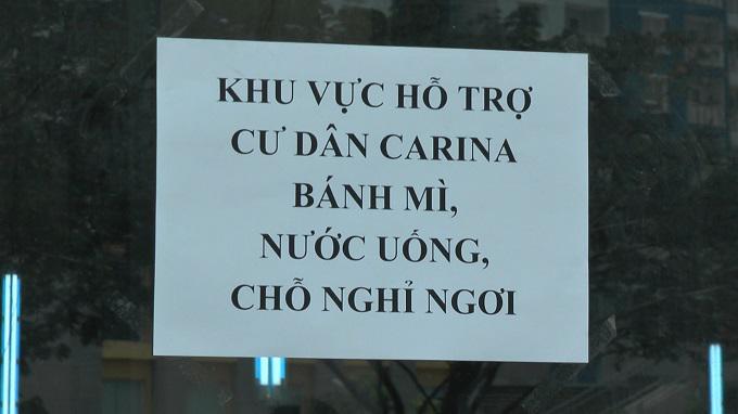 Ngay trước sảnh, nhiều phần thức ăn, nước uống... cùng những vật dụng thiết yếu cũng được chuẩn bị sẵn sàng phục vụ cư dân chung cư Carina. Phía bên trong, sảnh nền xi măng được lót bạt, chiếu cùng nhiều quạt máy công suất lớn để đảm bảo cho người dân được thoải mái khi sinh hoạt “nhờ”.
