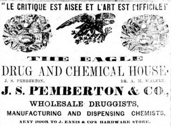 Quảng cáo treo trước cửa hàng y dược của Pemberton