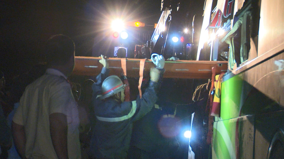 Lực lượng Cảnh sát PCCC và cứu hộ cứu nạn Công an tỉnh Phú Yên đã dùng máy cắt để cắt một phần cấu kiện của xe khách và sau hơn 2 giờ mới đưa được 2 nạn nhân ra ngoài cấp cứu.