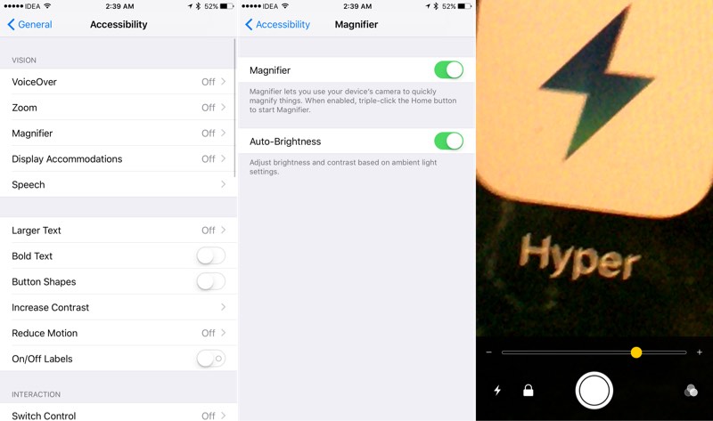 Bạn có thể sử dụng máy ảnh sử thi của iPhone như kính lúp cá nhân của bạn, phóng to thu nhỏ cách thức để đọc những điều bạn không thể với mắt thường của bạn. Để kích hoạt tính năng này, hãy vào "Settings" -> "General" -> “Accessibility” -> "Magnifier" và bật nó lên. Tiếp theo thời gian bạn muốn sử dụng tính năng này, ba lần kích chạm vào nút Home và nó sẽ hiển thị.