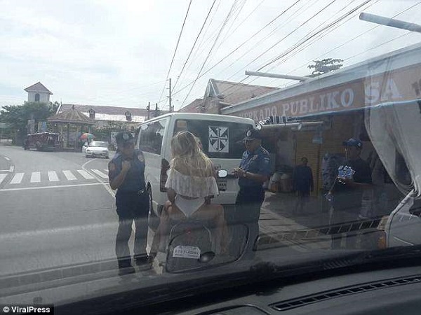 Vụ việc xảy ra ở đảo Bohol của Philippines cách đây ít ngày khi hai du khách phương Tây đèo nhau trên một chiếc xe máy. Nữ du khách ngồi sau mặc bộ bikini phản cảm và bị cảnh sát dừng xe. Người đàn ông điều khiển xe máy cũng cởi trần và điều khiển lạng lách trên đường.