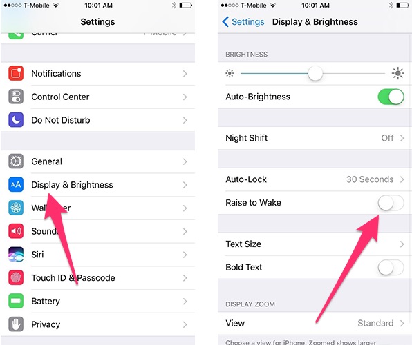 Các thế hệ từ iPhone 6s trở đi có tính năng "Raise to Wake", giúp người dùng cầm máy lên là màn hình sẽ tự động sáng và người dùng không cần nhấn nút bật tắt màn hình. Tuy nhiên đối với một số người tính năng này không thực sự cần thiết và nó gây tốn pin đáng kể. Để vô hiệu hoá hãy vào Settings > Display & Brightness > tắt Raise to Wake.