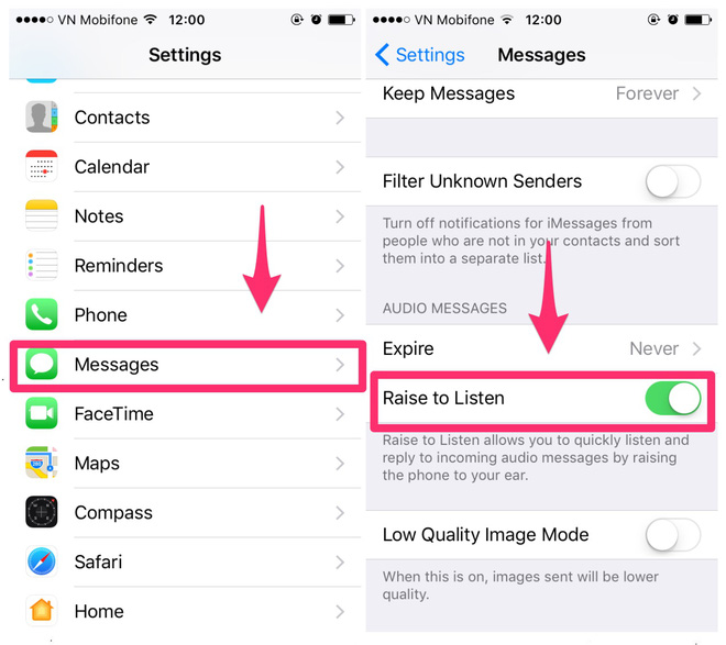 Tính năng này sẽ cho phép người dùng nghe và ghi âm những tin nhắn âm thanh trong iMessage mà không cần phải nhấn nút Play. Tuy nhiên nó rất tốn pin nếu chúng ta không hay gửi tin nhắn âm thanh. Vô hiệu hoá nó bằng cách vào Settings > Message > bỏ mục Raise to Listen.