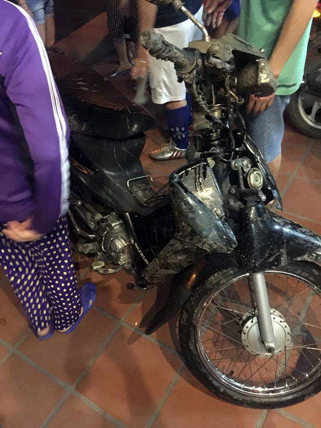 Một chiếc xe máy được người dân đưa lên khỏi hố tử thần.