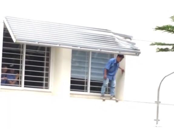 May mắn, người này rơi trúng mái của cửa sổ tầng 2 và kẹt lại tại đây. Do không bị thương nặng, nam sinh này leo vào bậu cửa sổ và cố thủ.
