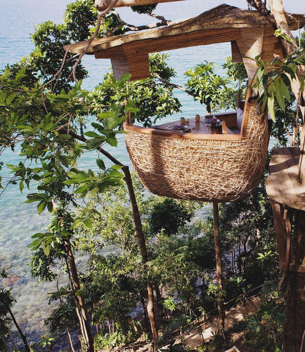 Nếu bạn muốn ăn trưa trong tổ chim thì nhà hàng Treepod Dining là lựa chọn hợp lý. Nhà hàng này thuộc quản lý của khu nghỉ mát Soneva Kiri Eco Resort (Thái Lan). Các "tổ chim" có độ cao khoảng 5 mét. Thức ăn được đưa lên phục vụ bằng hệ thống dây kéo.