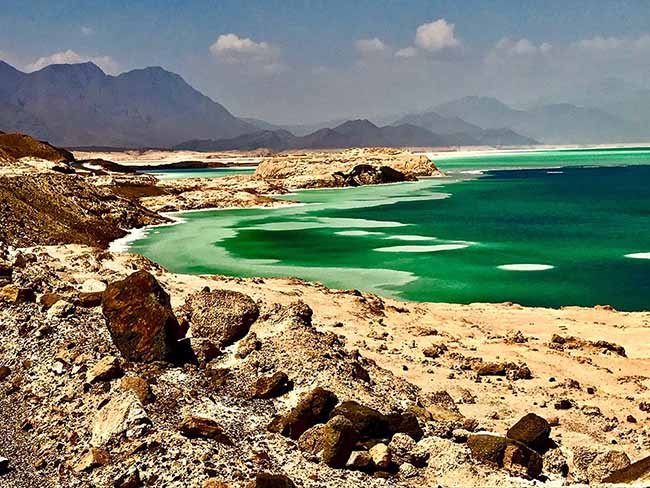 Djibouti được bao quanh bởi biển Đỏ và vịnh Aden, nơi đây nổi tiếng nhất là hồ Assal, được mệnh danh là món quà vô giá của mẹ thiên nhiên. Màu sắc của kỳ quan thiên nhiên này khiến du khách choáng ngợp, các mỏ muối trong hồ phát ra những màu xanh từ tinh thể, khiến mặt hồ lúc nào cũng lấp lánh đầy màu sắc.