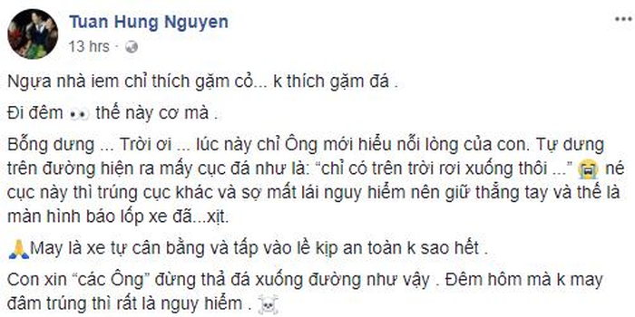 Rất may là sự cố lần này không gây ra gây nguy hiểm tới anh cũng như các xe khác khi di chuyển qua đoạn đường này. Đồng thời, nam ca sĩ Tuấn Hưng không quên khen chiếc siêu xe Ferrari 488 GTB của mình có khả năng tự cân bằng tốt.