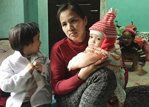 Chừng vài phút sau, tiếng trẻ con tíu tít đầu ngõ. Vợ ông, chị Nguyễn Thị Bích ẵm đứa con 15 tháng tuổi, theo sau là cặp sinh đôi 5 tuổi đang nô đùa quanh chân. Thằng Tiên xách chiếc bánh chưng lủng lẳng, còn con bé Thu ôm cái bắp cải trước bụng. Chị Bích bảo đó là bữa cơm chiều nay của gia đình, vừa mới xin được từ ngoại.