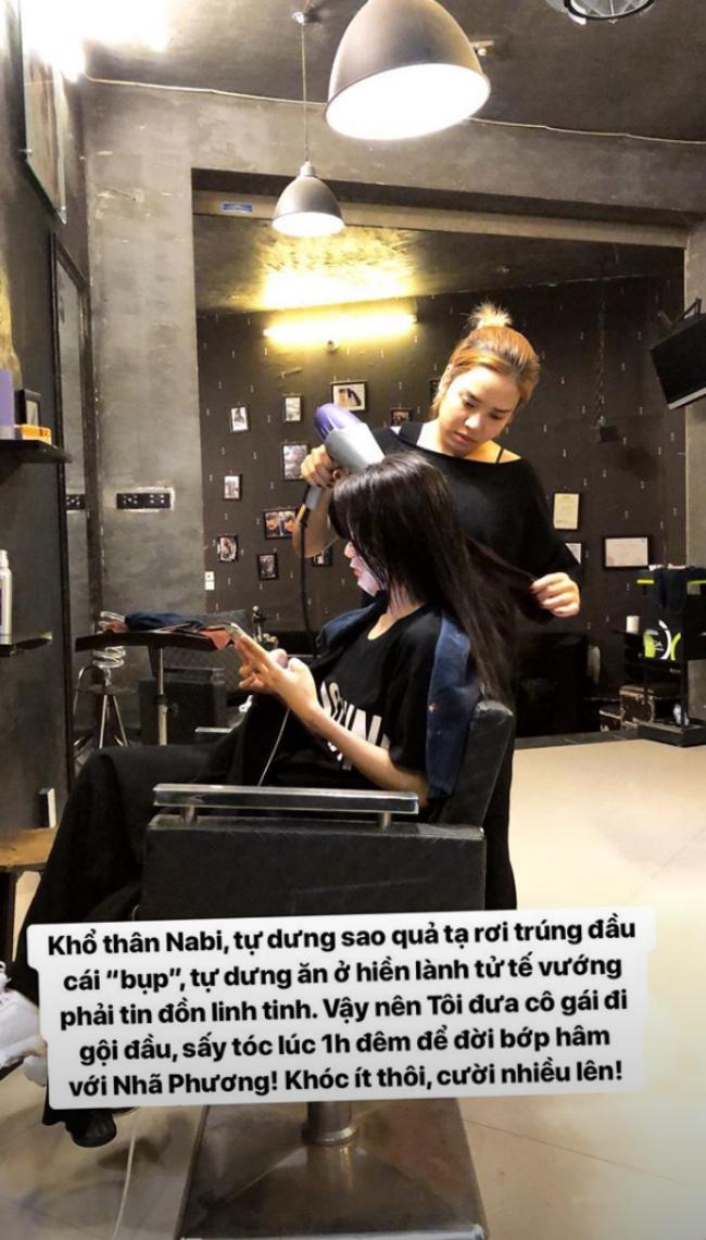 Kèm theo đó, Nguyễn Trần Trung Quân cho biết, “Khổ thân Nabi, tự dưng sao quả tạ rơi trúng đầu cái bụp, tự dưng ăn ở hiền lành tử tế vướng phải tin đồn linh tinh. Vậy nên tôi đưa cô gái đi gội đầu, sấy tóc lúc 1h đêm để đời bớt hâm với Nhã Phương. Khóc ít thôi, cười nhiều lên”.