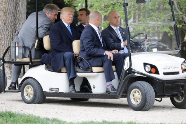 Ông Trump và ông Macron được chở bằng xe golf trong khuôn viên Mount Vernon. Sau khi tham quan dinh thự, vợ chồng tổng thống Mỹ và Pháp đã cùng nhau ăn tối.