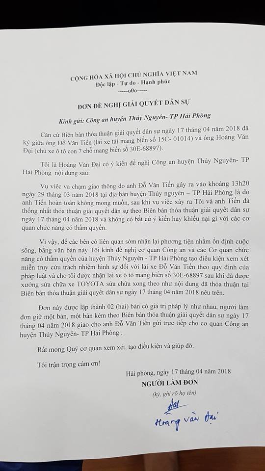 Trước khi diễn ra thoả thuận, anh Đại, chủ xe 7 chỗ đã có đơn gửi công an Thuỷ Nguyên để giải quyết vụ tai nạn theo hướng dân sự