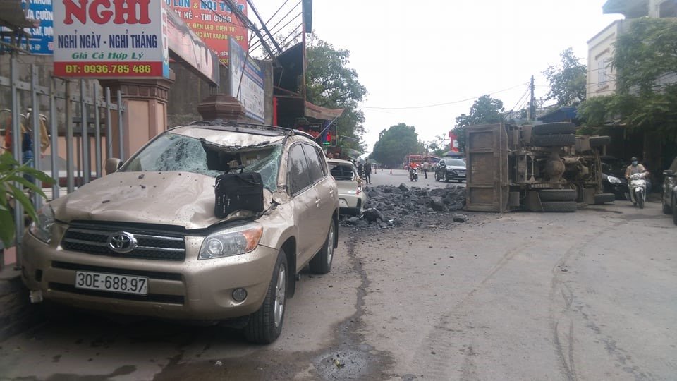 Vào khoảng 13h ngày 29/3, trên đường 359C (xã Hòa Bình, huyện Thủy Nguyên, TP Hải Phòng) đã xảy ra vụ tai nạn liên hoàn khiến xe tải bị lật và hai xe con hư hỏng.