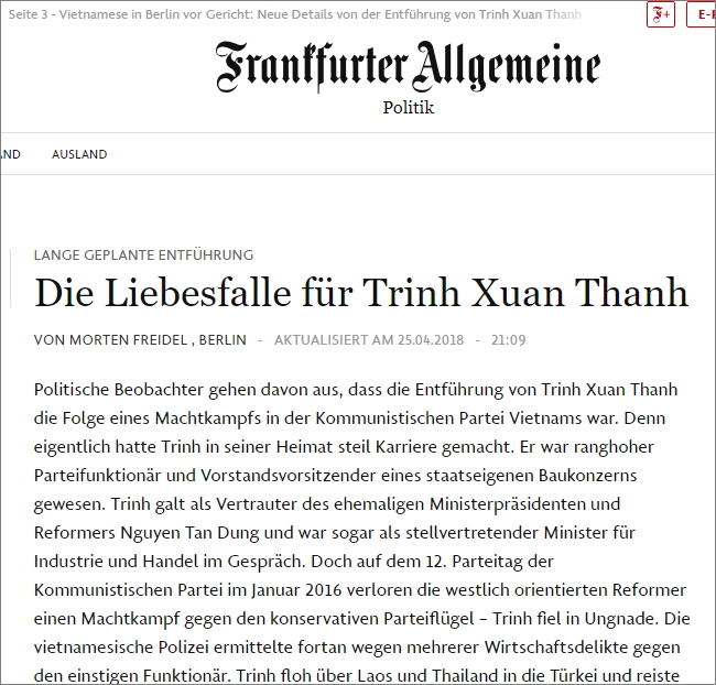 Hôm nay 26/04/2018 tờ Frankfurter Allgemeine (báo in), một nhật báo uy tín trên nước Đức và có tầm vóc liên bang, đã đăng một bài báo về vụ Trịnh Xuân Thanh bị mật vụ Việt Nam bắt cóc tại Berlin.