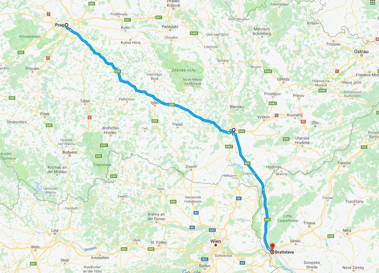 Hành trình của chiếc xe Mercedes lưu trữ trong hệ thống định vị GPS chỉ rõ lộ trình di chuyển là: Praha - Brno – Bratislava