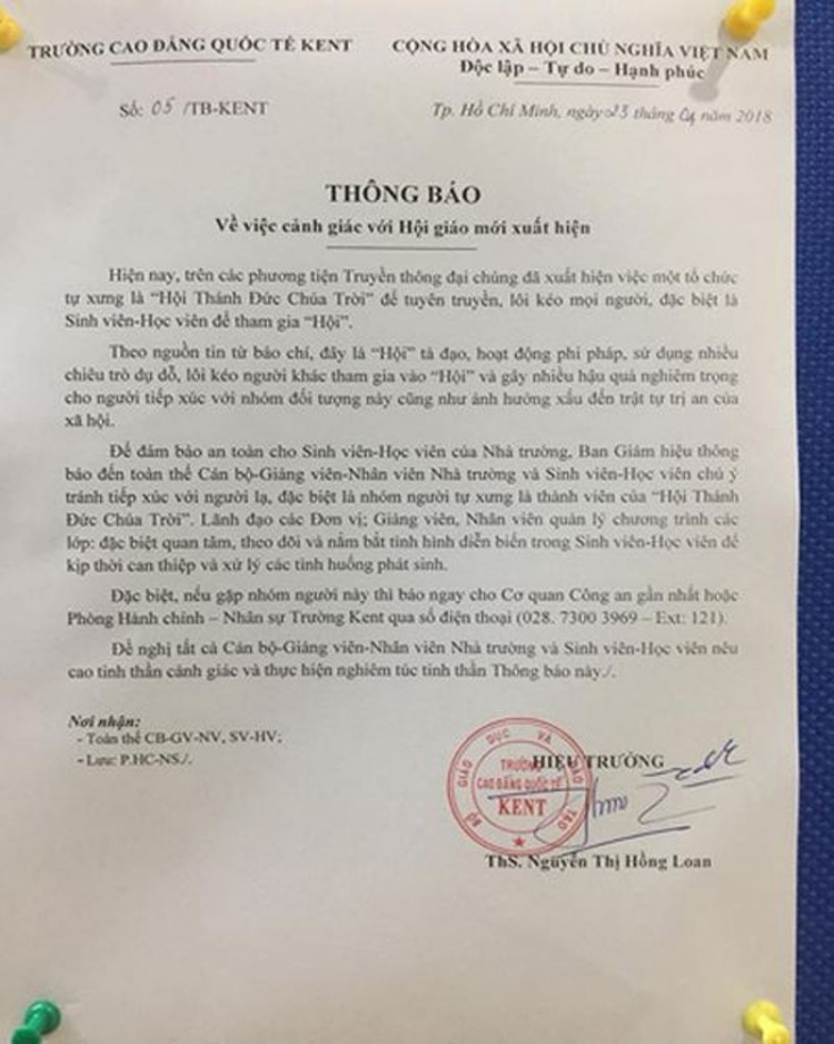 “Lănh đạo nhà trường kêu gọi sinh viên, học sinh, cán bộ, giảng viên, nhân viên của trường tránh tiếp xúc với người lạ mặt, đặc biệt là nhóm người xưng ‘Hội Thánh Đức Chúa Trời’. Đặc biệt, nếu mọi người gặp nhóm người đến từ hội thánh tự xưng này, th́ hăy báo cho cơ quan Công an gần nhất, hoặc báo về pḥng Hành chính - nhân sự của nhà trường”, trích thông báo khẩn của trường CĐ Quốc tế Kent.