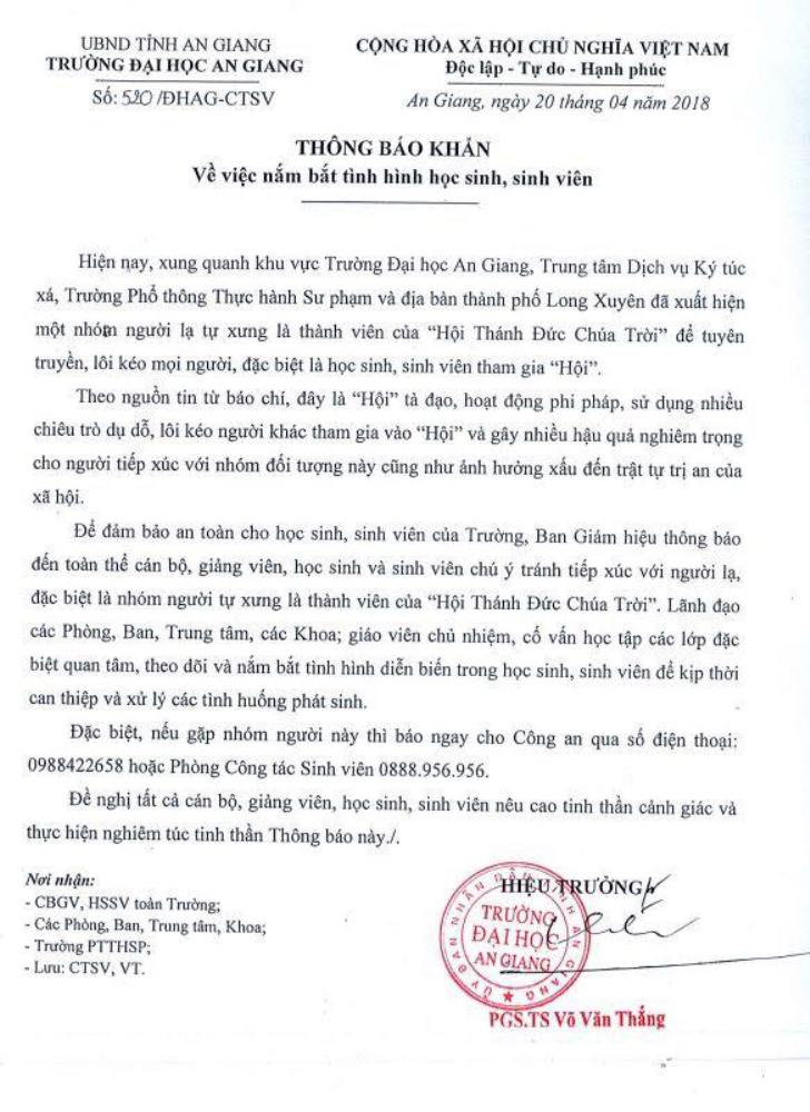 Ngày 21/4 vừa qua, BGH trường Đại học An Giang cũng ra thông báo khẩn sau khi có thông tin một nhóm người lạ tự xưng là thành viên của Hội Thánh Đức Chúa Trời đến tuyên truyền, lôi kéo mọi người, đặc biệt là học sinh, sinh viên tham gia vào hội này ở khu vực trường, Trung tâm Dịch vụ kư túc xá, trường Phổ thông Thực hành sư phạm và địa bàn TP. Long Xuyên.