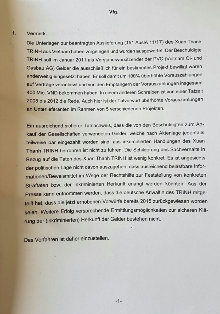 Đáp: Tôi có các thông báo đình chỉ điều tra của Viện Công tố, đặc biệt của Viện Công tố Berlin, thông báo cuối cùng vào tháng 8/2017, trong những thông báo đình chỉ điều tra thì có đề cập cả đến hồ sơ đề nghị dẫn độ của CHXHCN Việt Nam đối với thân chủ của tôi là Trịnh Xuân Thanh, mà trong đó có những mô tả mơ hồ và không rõ ràng, từ đó cho thấy không có liên quan gì tới hành vi rửa tiền nào ở Đức cả. Như đã nói có nhiều cuộc điều tra nhưng do thiếu bằng chứng phạm tội nên đã được đình chỉ theo điều 170 đoạn 2 của Luật tố tụng hình sự của Đức. Ở đây người ta phải giải thích như sau: Nếu ai đó nộp một số tiền lớn vào một ngân hàng ở Đức thì ngân hàng đó có thể và trong nhiều trường hợp là phải thông báo có sự ngờ vực. Như tôi được biết, trong tất cả những trường hợp ở đây đều có chứng từ chứng minh được nguồn gốc tiền của những người liên quan. Tuy nhiên, đây cũng là một sự luyện tập tốt ở Đức, cho dù chỉ có một biểu hiện nghi ngờ là có sự thông báo từ phía ngân hàng, sau đó cảnh sát sẽ điều tra và kết quả điều tra phải được báo cáo lên Viện Công tố và họ sẽ quyết định xem có đình chỉ việc điều tra hay không hay việc nghi ngờ là có cơ sở. Trong tất cả những cuộc điều tra này, Viện Công tố đã đi đến kết luận là hoàn toàn không có hành vi rửa tiền, vì vậy đã đình chỉ tất cả các cuộc điều tra. Vì những người liên quan trước đó đã không được biết về việc điều tra, nên thông báo đình chỉ điều tra không gửi cho họ mà nằm ở hồ sơ của Viện Công tố.