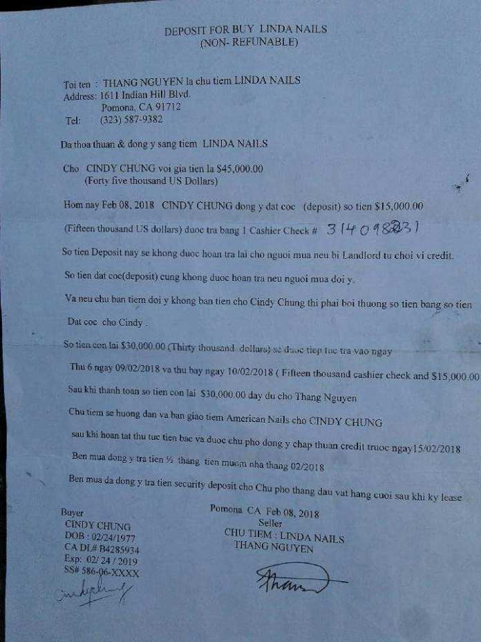 Đại ý anh Thắng “đã thỏa thuận và đồng ý sang tiệm Linda Nails cho Cindy Chung với giá tiền là $45,000. Ngày Thứ Năm, 8 Tháng 2, 2018 bên mua đặt cọc $15,000 trả bằng cashier check. Ngày Thứ Sáu, 9 Tháng Hai trả tiếp $15,000 bằng cashier check, và Thứ Bảy, 10 Tháng Hai trả $15,000 còn lại bằng tiền mặt.”